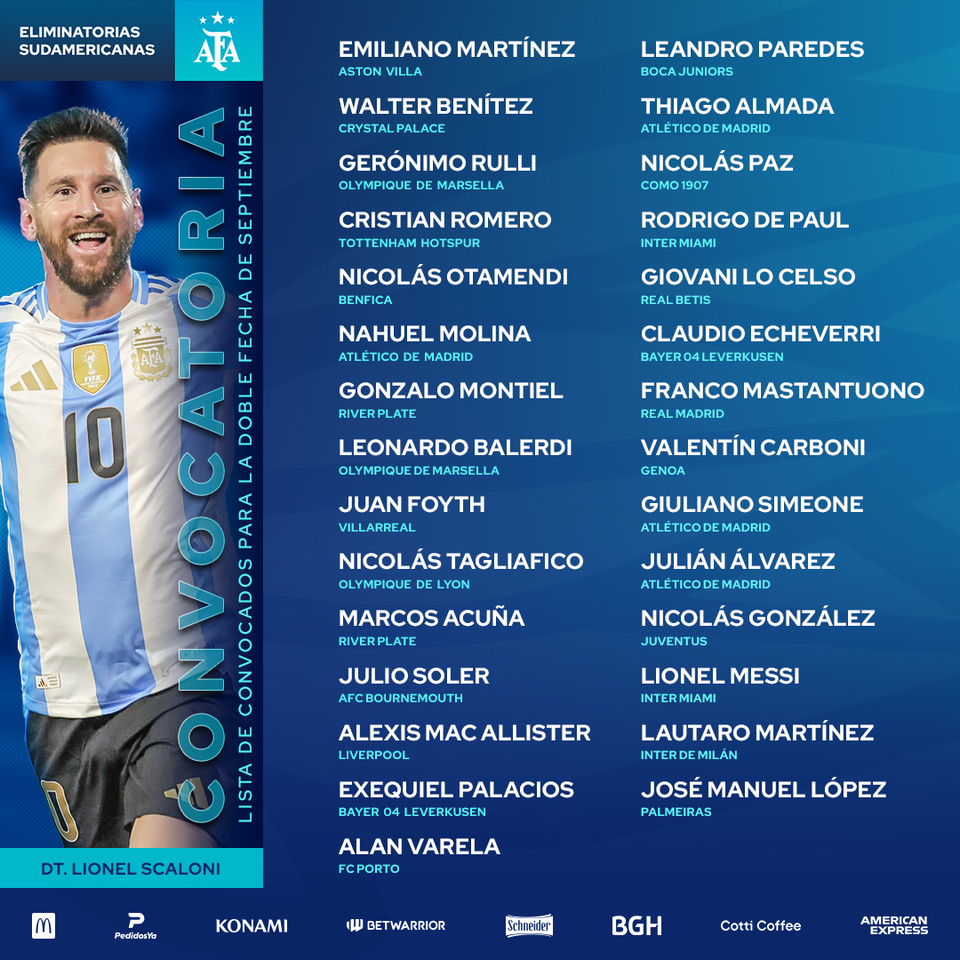 El entrenador de la Selección Argentina, Lionel Scaloni, anunció la lista de convocados para la doble fecha final de las Eliminatorias Sudamericanas rumbo al Mundial 2026, con un condimento especial: será el último partido de Eliminatorias que dispute Lionel Messi con la Albiceleste.
