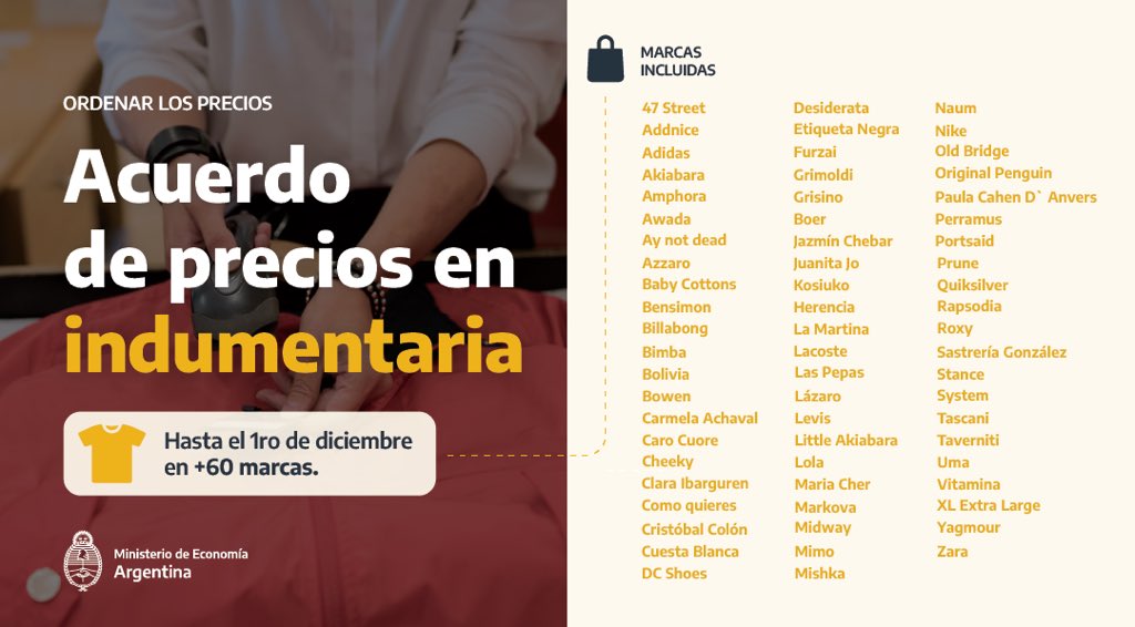 La medida comprende los precios de más de 60 marcas que estarán disponibles en todo el territorio nacional en shoppings, supermercados y locales propios de las firmas. Además, dispone que a partir del 1 de diciembre y por el plazo de 180 días los precios se adecuarán en relación a la variación del tipo de cambio oficial.