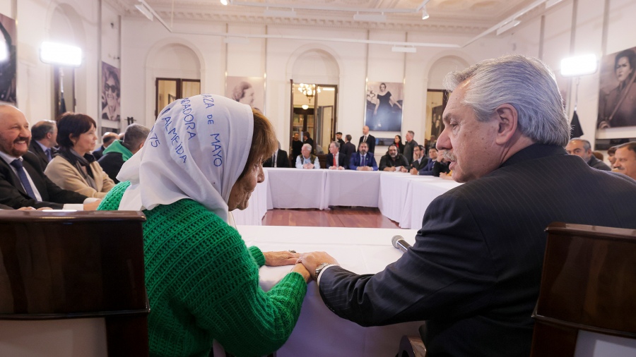 «Celebro que la comunidad argentina hoy esté llenando las plazas, reivindicando la convivencia, el respeto, la democracia y celebrando que Cristina está bien», señaló Fernández en el Salón de las Mujeres, acompañado por Estela de Carlotto (Abuelas de Plaza de Mayo) y Taty Almeida (Madres de Plaza de Mayo Línea Fundadora); el jefe de Gabinete, Juan Manzur; la portavoz de la Presidencia, Gabriela Cerruti; y la secretaria de Asuntos Estratégicos, Mercedes Marcó del Pont.