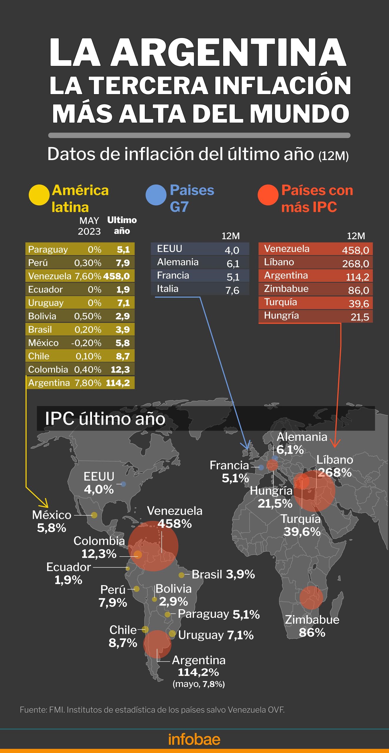 La Argentina registró en mayo la tercera inflación más alta del mundo Infografía de Marcelo Regalado.A nivel mundial, el mes pasado Venezuela registró una inflación del 458% según el OVF –el último dato oficial, del banco central de ese país, fue de abril y llegó al 471%- y El Líbano el 268%. Zimbabue, que hasta el año pasado lideraba esta infame tabla, cambió su metodología al introducir una canasta de precios en dólares y en mayo informó una suba anual del 86,5%.