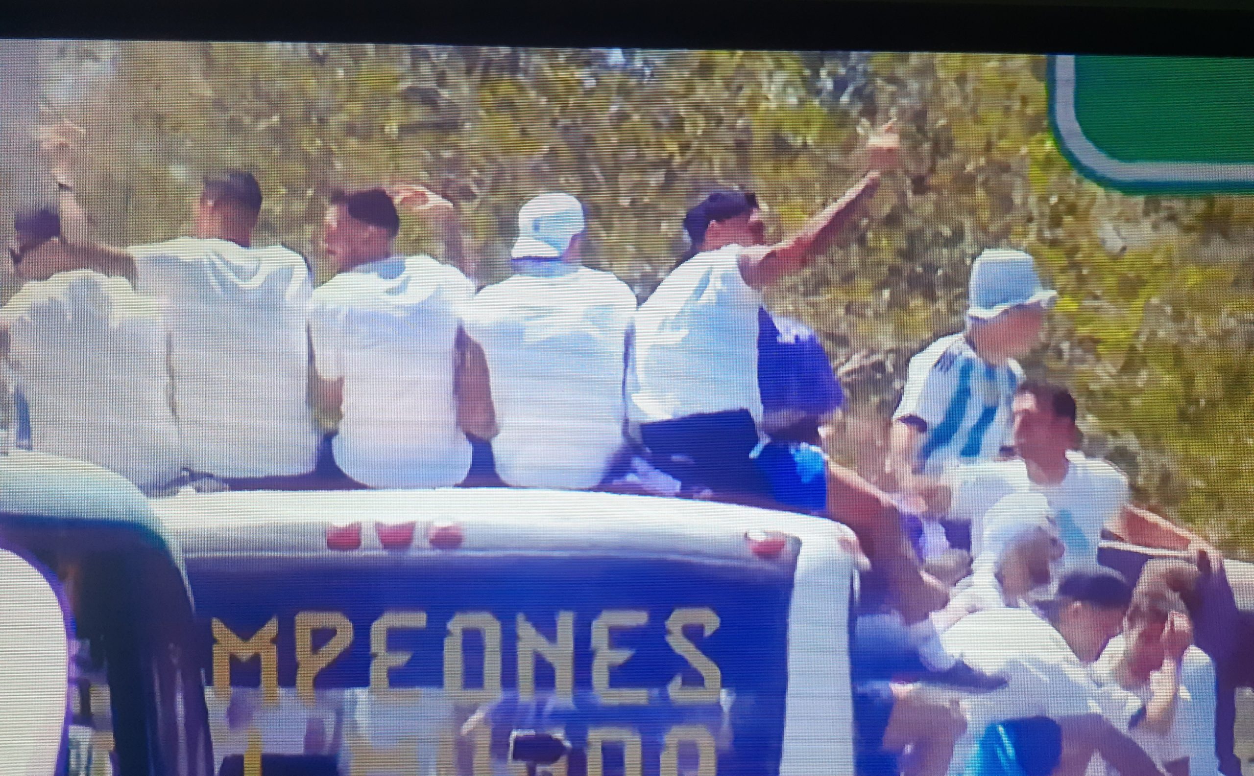 Paredes, De Paul, Messi, Di María y Otamendi van sentados arriba del micro y el resto de la Scaloneta está distribuida en el colectivo para poder saludar a toda la gente. Enzo Fernández lleva la Copa.