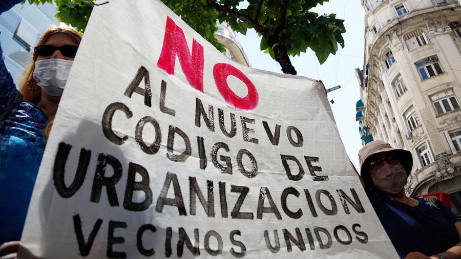 Mientras en el salón San Martín de la Legislatura se desarrolla el plenario de comisiones, afuera del edificio parlamentario, en la calle Perú al 100, organizaciones ambientales y políticas que rechazan las iniciativas inmobiliarias de Rodríguez Larreta se concentraron con la consigna «¡Basta de torres, queremos espacios verdes! y ofrecían una conferencia de prensa.