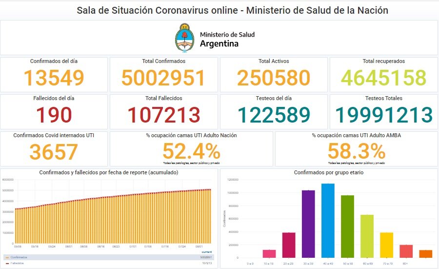 El Ministerio de Salud confirmó 13.549 nuevos contagios en las últimas 24 horas, son 5.002.951 los casos desde que comenzó la pandemia. Se registraron 190 nuevas muertes de pacientes con coronavirus, lo que eleva la cifra de víctimas mortales en el país a 107.213.
