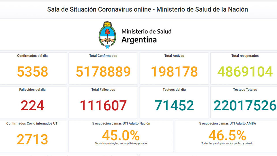 El reporte diario del Ministerio de Salud indicó que la cifra de víctimas mortales en el país asciende a 111.607 personas. Las camas de cuidados intensivos siguen ocupadas por debajo del 50% de su capacidad, un 45 por ciento a nivel nacional y en un 46,5 por ciento en el Área Metropolitana de Buenos Aires.