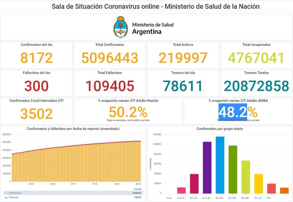 El reporte diario del Ministerio de Salud confirmó 8172 nuevos contagios de coronavirus en las últimas 24 horas, se suman 5.096.443 casos desde que comenzó la pandemia.