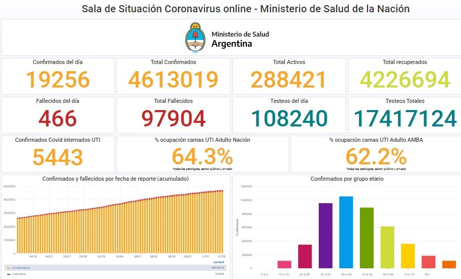 El Ministerio de Salud confirmó 19.256 nuevos contagios de coronavirus y 466 nuevas muertes en las últimas 24 horas.
