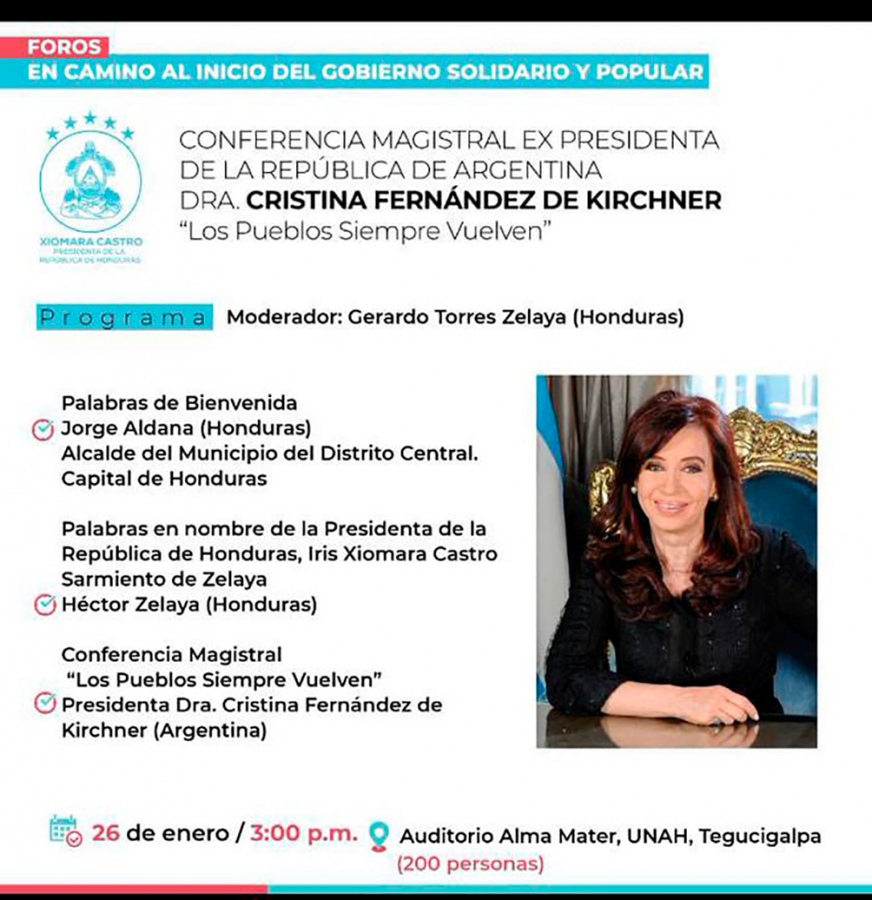 El alcalde del municipio del distrito central de Tegucigalpa, Jorge Aldana, dará la bienvenida y luego, en representación de la mandataria electa Xiomara Castro, hablará Héctor Zelaya.El encuentro se enmarca en el ciclo de foros «En camino al inicio del Gobierno solidario y popular», en relación a la inminencia de la llegada de Castro a la Presidencia de Honduras, y destaca la presencia de Fernández de Kirchner por su carácter de expresidenta de la Argentina.