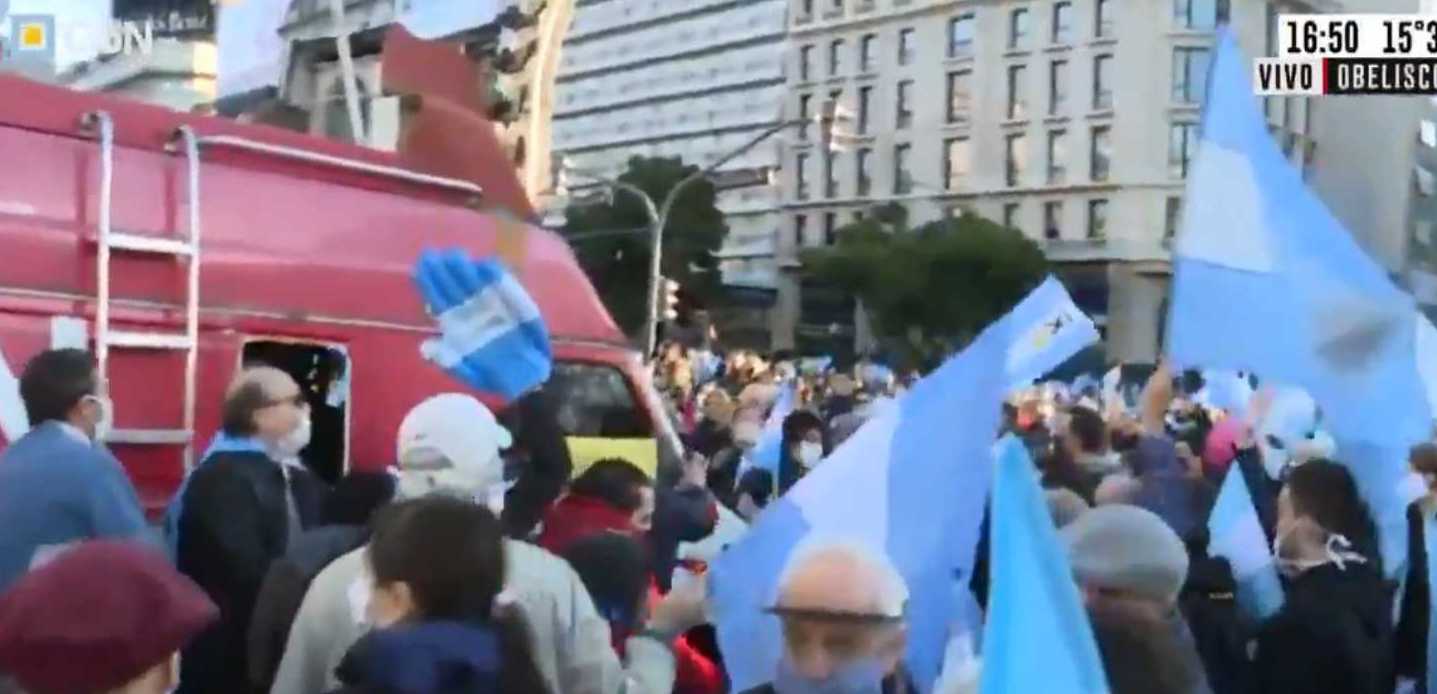 «¡Van a empezar a tener miedo, hijos de puta!», gritó uno de los manifestantes mientras golpeaba la puerta del móvil televisivo, quien fue captado desde dentro del camión por un teléfono celular.