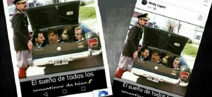 Se trata de una publicación en Facebook de una directora de escuela de Villa Gobernador Gálvez en la que se ve una imagen editada de un Falcon verde con el baúl abierto donde están las cabezas de Alberto Fernández, Cristina Fernández, Axel Kiciloff y Sergio Massa. Parado junto al auto, está la imagen del dictador Videla.