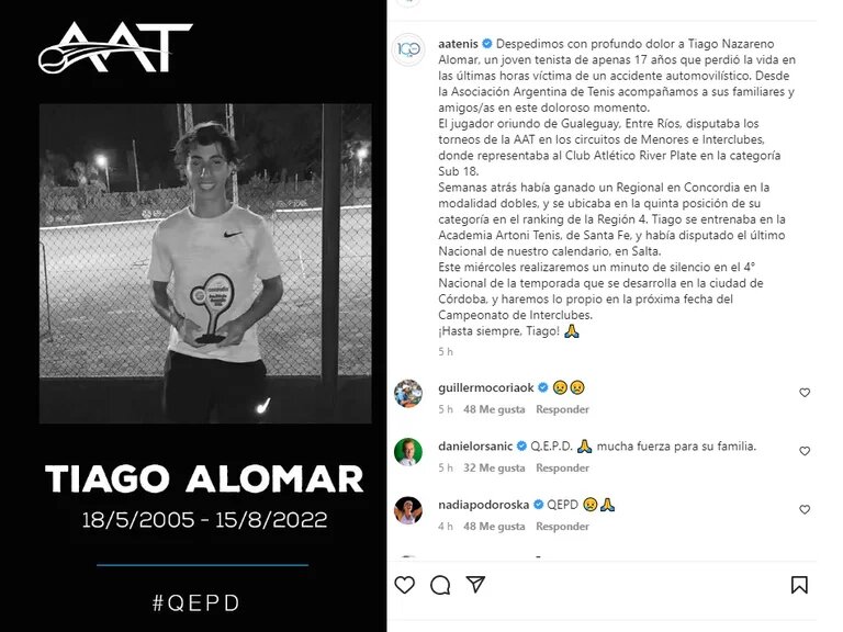 Tiago Alomar tenía 17 años y era una de las máximas promesas del tenis de Entre Ríos (@tiago_alomar)La propia Asociación Argentina de Tenis lamentó la muerte de una de sus máximas promesas con una publicación en las redes sociales. Guillermo Coria, actual capitán del equipo de Copa Davis, Nadia Podoroska y Daniel Orsanic, entre otras figuras del tenis nacional, se mostraron conmovidos con la noticia y así lo reflejaron en el siguiente el posteo: