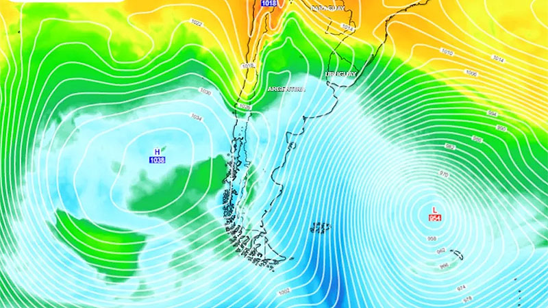 Este frente abrirá las puertas para la irrupción de frío más importante del año hasta el momento en el centro y norte de la Argentina, “canalizándose el fuerte viento sur a través de un extenso corredor sobre el Mar Argentino, con aire gélido proviniendo de latitudes bien altas”.