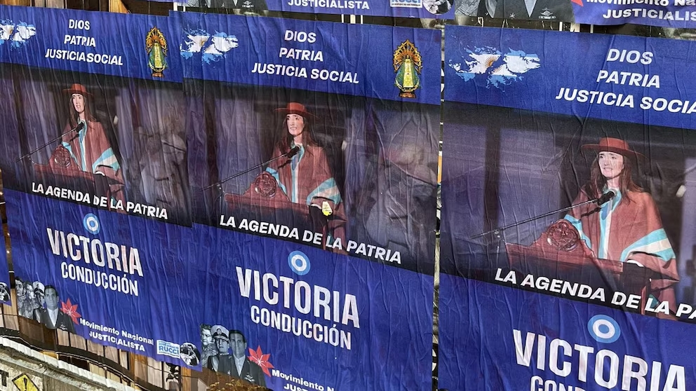 Los afiches en cuestión tienen la foto de la vicepresidente, la leyenda “Dios, Patria, Justicia Social. La agenda de la Patria”. Arriba las Islas Malvinas pintadas de celeste y blanco, la Virgen de Luján, una escarapela y, en el centro y con letras de grandes dimensiones “Victoria Conducción”. La firma es del Movimiento Nacional Justicialista y una agrupación identificada como José Ignacio Rucci. La clave: aparecieron alrededor del Congreso de la Nación. Los de la foto que ilustra esta nota estaban en la Avenida Rivadavia al 1900.