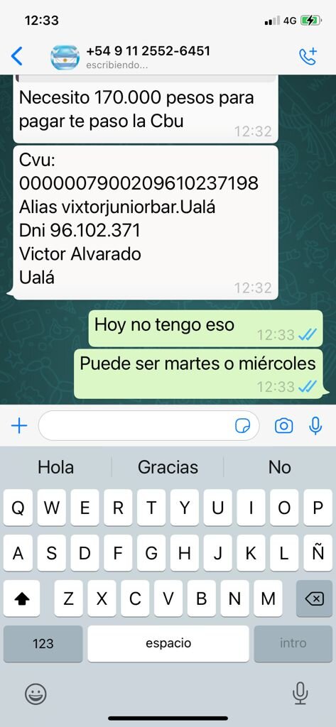 El mensaje sigue con el pedido de dinero, en este caso una oportunidad para cambiar dólares a buen precio, y un número de cuenta bancaria a través para hacer el depósito.”Necesito 170.000 para pagar te paso la Cbu”, sigue el mensaje del estafador que envía un cvu asociado al dni 96.102.371 y el nombre Victor Alvarado.