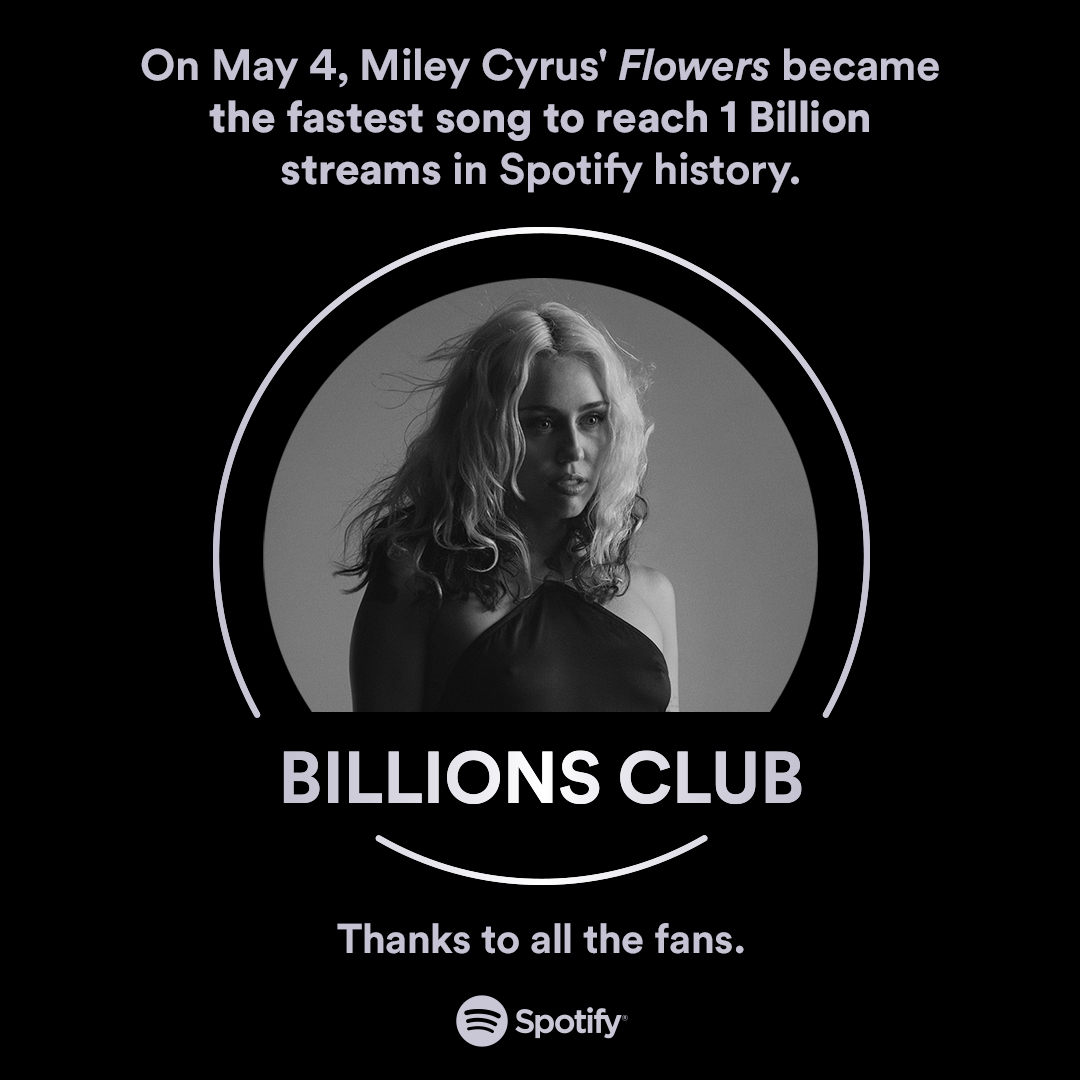 En el día de ayer, 4 de mayo de 2023, el exitoso tema de Miley Cyrus «Flowers» batió otro récord al convertirse en la canción que más rápido alcanzó los mil millones de streams en la historia de Spotify.