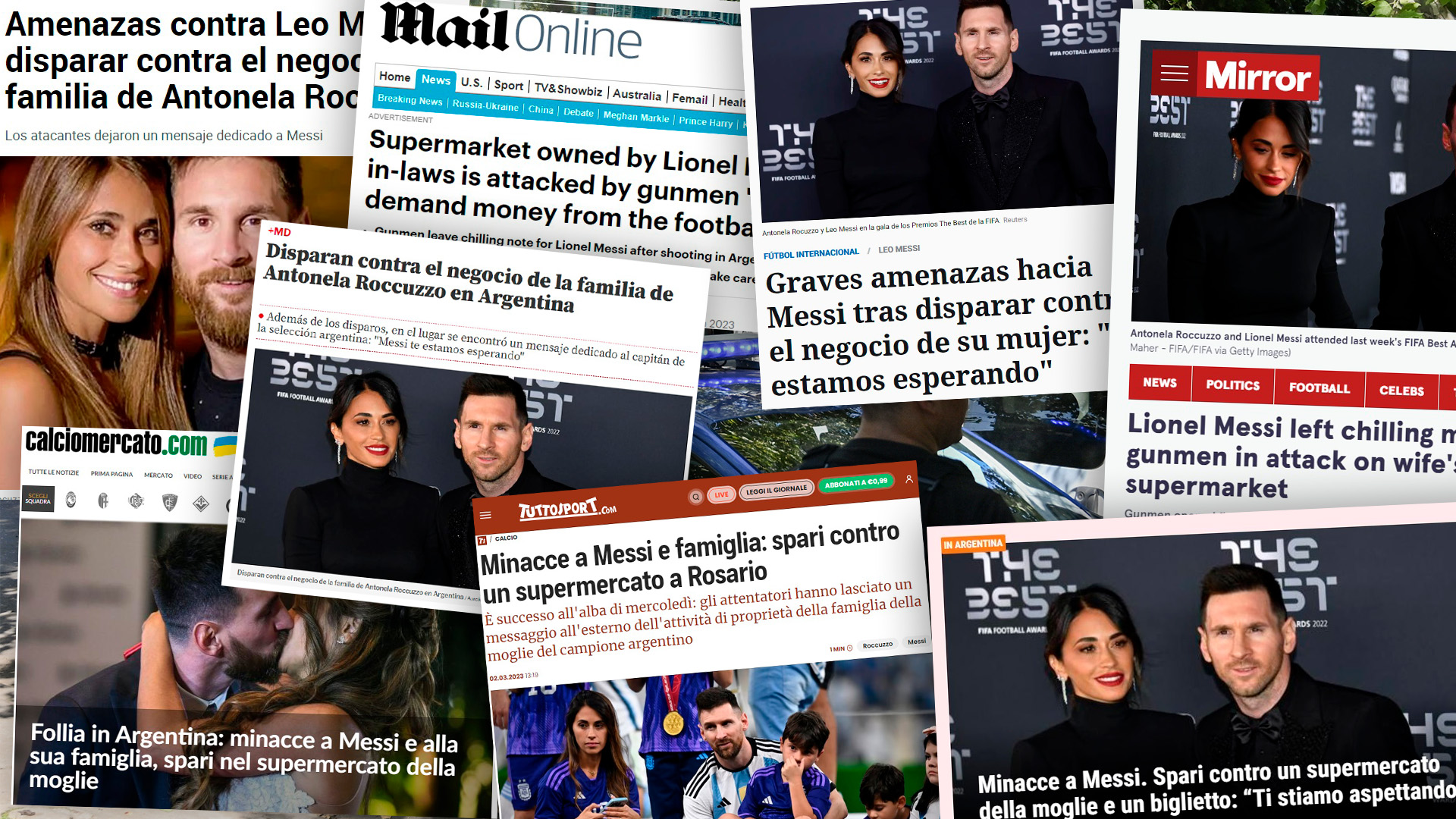 La prensa internacional replicó con fuerza la noticia de las amenazas contra Leo Messi y la familia de su esposa, Antonela Rocuzzo, en la ciudad argentina de Rosario. “Amenazas a Messi. Tiroteos contra el supermercado de una esposa y una nota: ‘Te estamos esperando’”, título la Gazzetta dello Sport, el principal diario deportivo italiano. El rotativo habló de “intimidación muy seria” contra el futbolista y su familia, después que el supermercado de la familia de Rocuzzo fue baleado en la madrugada de este jueves.