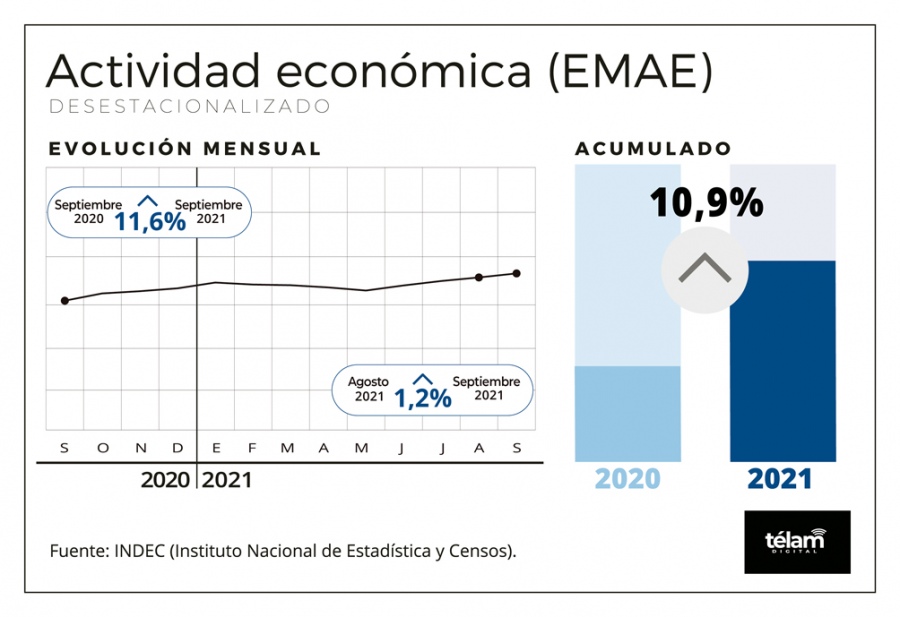 Según el Instituto Nacional de Estadística y Censos, el nivel de actividad económica creció durante septiembre 11,6% respecto a igual mes del año pasado. Además, el Estimador Mensual de la Actividad Económica (EMAE) registró en septiembre un avance del 1,2% respecto a agosto y acumuló una suba del 10,9% en los primeros diez meses del año.