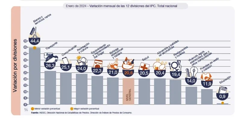 Por debajo del nivel general se ubicaron las divisiones de Salud (20,5%), Alimentos y bebidas no alcohólicas (20,4%), Restaurantes y hoteles (19,4%), Vivienda, agua, electricidad, gas y otros combustibles (14%), Prendas de vestir y calzados (11,9%) y Educación (0,9%, en pleno receso estival).