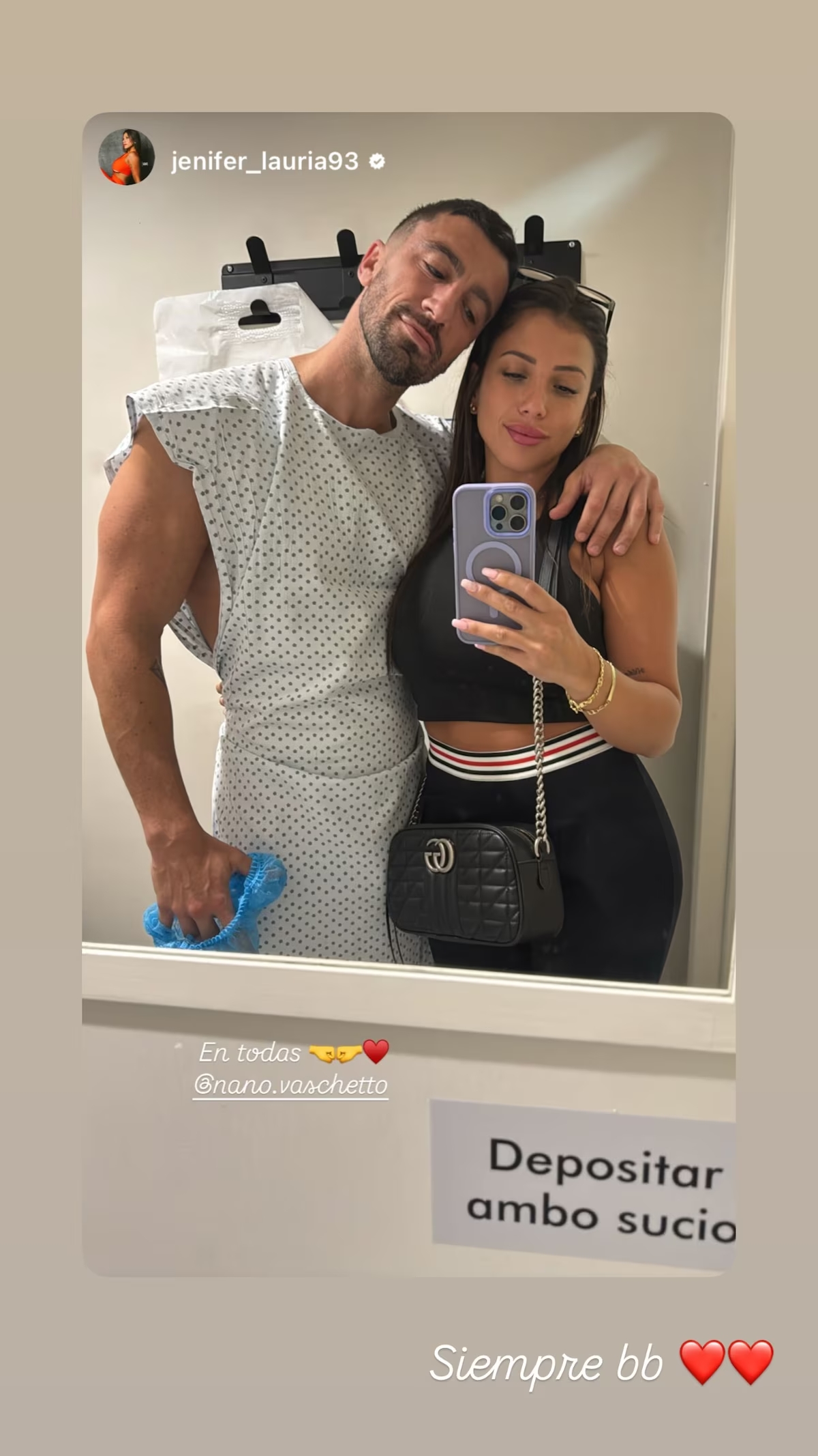 En medio de esa situación, compartieron una selfie tomada frente al espejo del baño del hospital. En la imagen se los ve abrazados, él aún en bata y con una redecilla azul en la mano, apoyando la cabeza sobre su hombro. El texto que eligió Lauría fue escueto pero significativo: “En todas”, acompañado de emojis de corazones. Al fondo, un cartel pegado en la pared que decía “Depositar ambo sucio” le sumó una cuota de picardía a la escena, que fue rápidamente detectada por los fanáticos de la pareja.