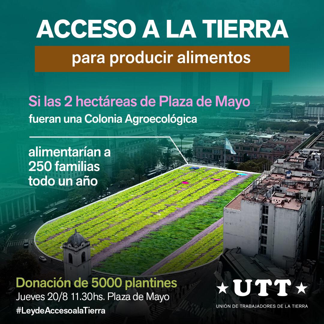 Hoy jueves 20 de agosto, la Unión de Trabajadores/as de la Tierra (UTT) realizará una acción en Plaza de Mayo para visibilizar la situación del campesinado y los pequeños productores en todo el país en relación al acceso a la tierra. Con esta intervención, que incluye la donación de 5.000 plantines, presentarán nuevamente al Congreso de la Nación el proyecto de Ley de Acceso a la Tierra y le harán llegar la propuesta al presidente Alberto Fernández.