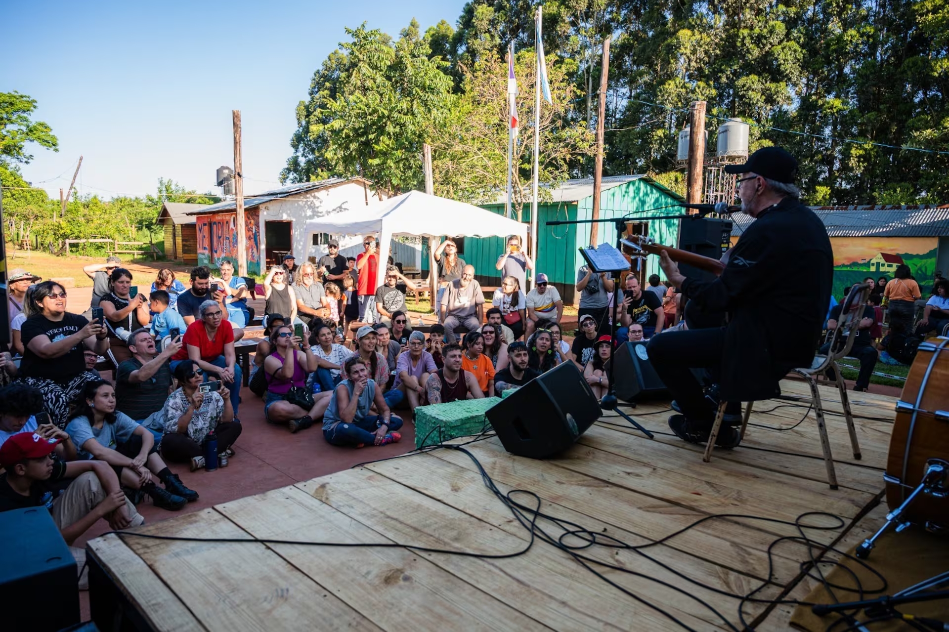 La escuela, fundada por docentes que hace una década decidieron apostar al arraigo de los jóvenes y a la defensa de la tierra, recibió al músico con una fiesta popular. Hubo canciones, teatro de títeres, talleres culturales y un homenaje especial a Hugo Soriani, el recordado director de Página/12, cuyo apoyo periodístico ayudó a visibilizar las luchas de la comunidad.