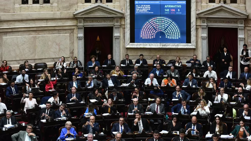 La segunda versión del proyecto de ley Bases obtuvo la aprobación en general en la Cámara de Diputados minutos antes de las 9 de la mañana con 142 votos afirmativos (106 en contra), gracias al apoyo mayoritario de los bloques dialoguistas (PRO, UCR, Hacemos, Innovación Federal y MPN). Sin embargo, la aprobación de los capítulos en particular será larga dado que todavía podrían ser rechazados o modificados puntos clave como las facultades delegadas para disolver organismos públicos, el impuesto a las Ganancias, el régimen de grandes inversiones, la reforma laboral, los impuestos al tabaco y las privatizaciones.