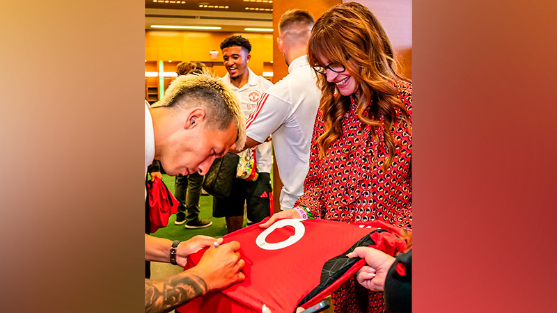 La célebre actriz de 55 años, ganadora de un premio Óscar y tres Globo de Oro, aprovechó la estadía de los Diablos Rojos en el país de Norteamérica para ir a saludar a los jugadores del equipo por el cual simpatiza. La protagonista de Mujer Bonita y Erin Brockovich, entre otras exitosas películas, se sacó fotos con los integrantes del plantel del United y se llevó un regalo de parte del defensor argentino Lisandro Martínez.