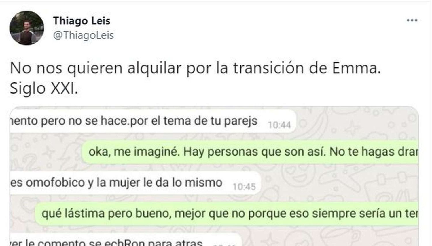 “No nos quieren alquilar por la transición de Emma. Siglo XXI”, escribió Thiago Leis (27) en sus redes sociales, al tuit le sumó una captura de pantalla de un chat con una amiga que le hacía de intermediara con el dueño del departamento que tenía pensado alquilar.