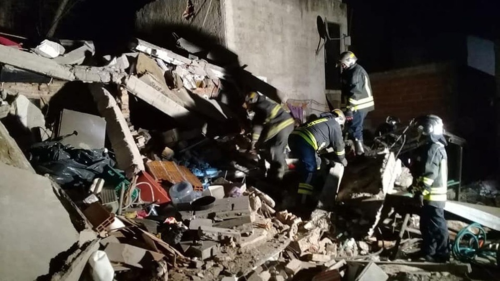 Los Bomberos trabajan en la calle París 1131 donde ocurrió el desmoronamiento, en un operativo en el que participaron también perros entrenados en la búsqueda de personas.