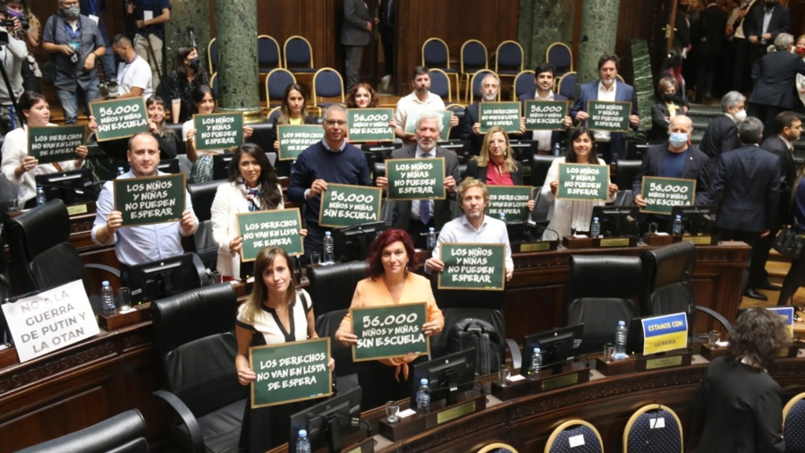 Los legisladores del Frente de Todos recibieron a Horacio Rodríguez Larreta con carteles que denuncian la falta de vacantes en escuelas públicas de la Ciudad. Foto: Prensa Legislatura