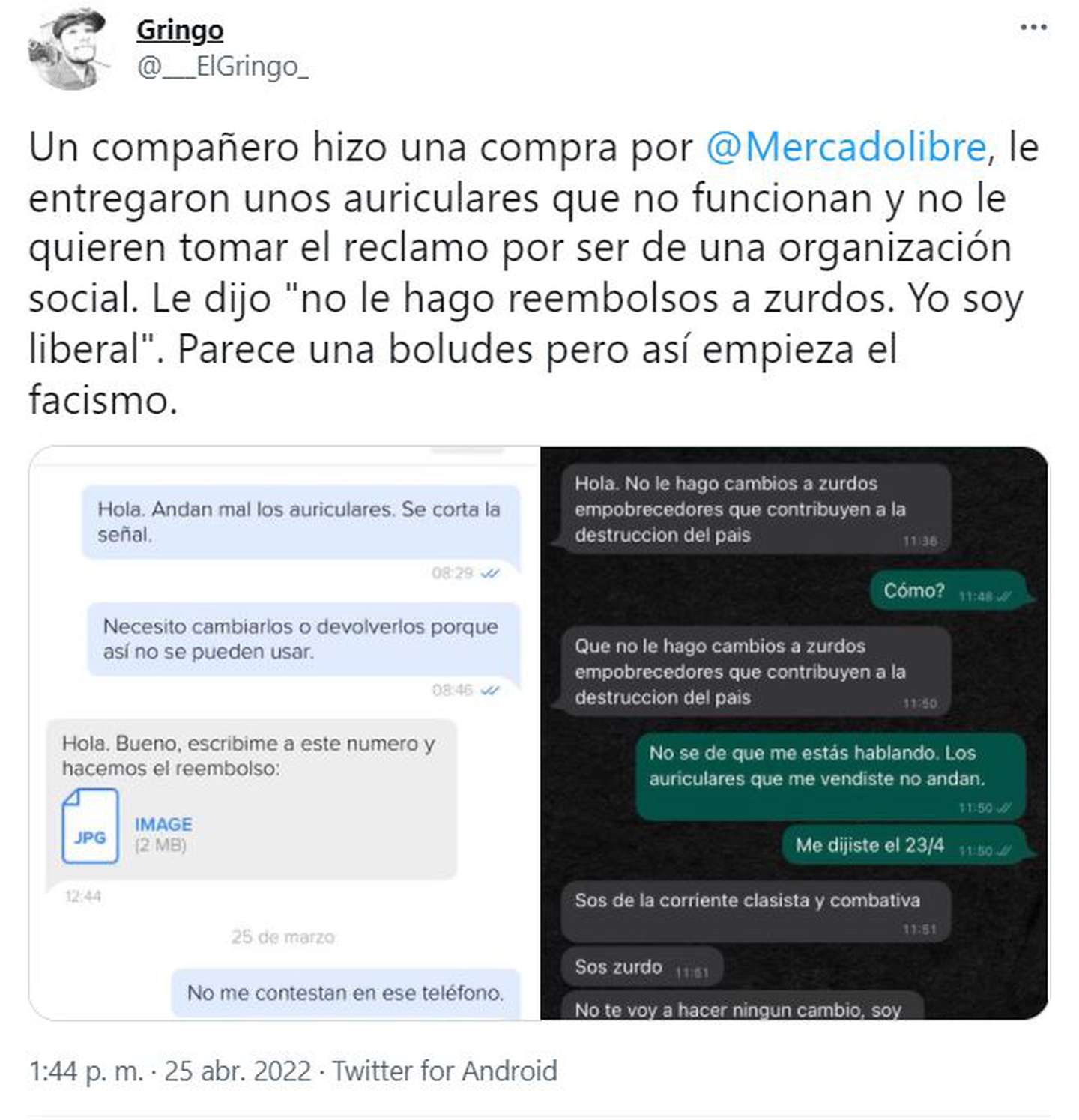 Un joven dio a conocer la historia a través de Twitter. “Un compañero hizo una compra, le entregaron unos auriculares que no funcionan y no le quieren tomar el reclamo por ser de una organización social”, contó el usuario @___ElGringo_. Y continuó: “Le dijo ‘no les hago reembolsos a zurdos. Yo soy liberal’. Parece una boludez, pero así empieza el fascismo”.