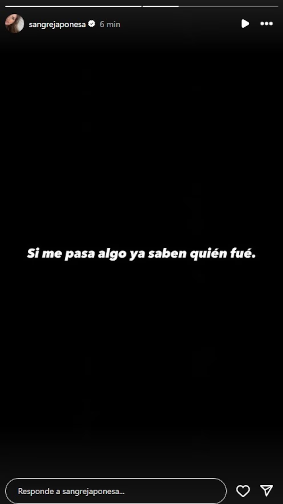 Ante esta sucesión de mensajes, la actriz subió una historia con fondo negro y letras blancas que decía: “Si me pasa algo, ya saben quién fue”.