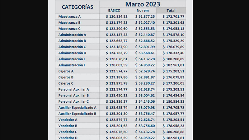 Los salarios básicos de febrero (a cobrar en marzo) fueron de $165.900, mientras que en marzo (a cobrar en abril), llegará a $182.961. En ambos casos, incluye el presentismo.