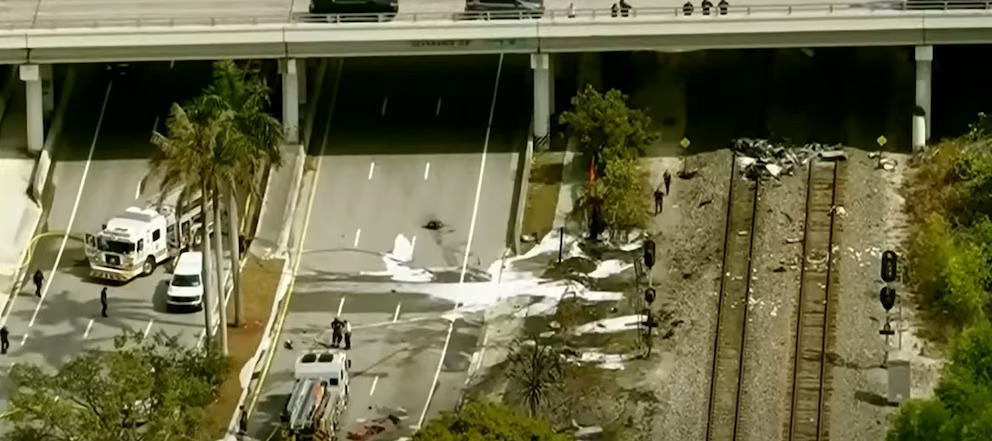 La aeronave se desplomó en la zona de 3700 Airport Road, a un costado del aeropuerto regional, de acuerdo con información divulgada por WPTV y actualizaciones en tiempo real de la policía local. El punto de impacto se ubicó exactamente sobre las vías ferroviarias que corren paralelas a la I-95, provocando la interrupción de varias rutas principales del sur de Florida.