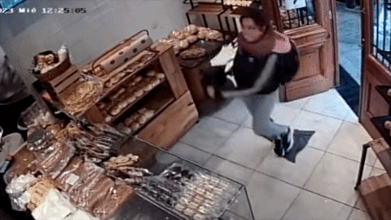 En un video capturado por la cámara de seguridad, se puede ver a las personas bailando para obtener las medialunas que ofrece la panadería.